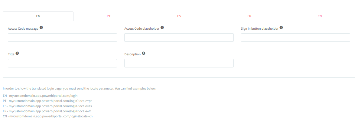 In order to show the translated login page, you must send the locale parameter. You can find examples below: EN - mycustomdomain.app.powerbiportal.com/login PT - mycustomdomain.app.powerbiportal.com/login?locale=pt ES - mycustomdomain.app.powerbiportal.com/login?locale=es FR - mycustomdomain.app.powerbiportal.com/login?locale=fr CN - mycustomdomain.app.powerbiportal.com/login?locale=cn