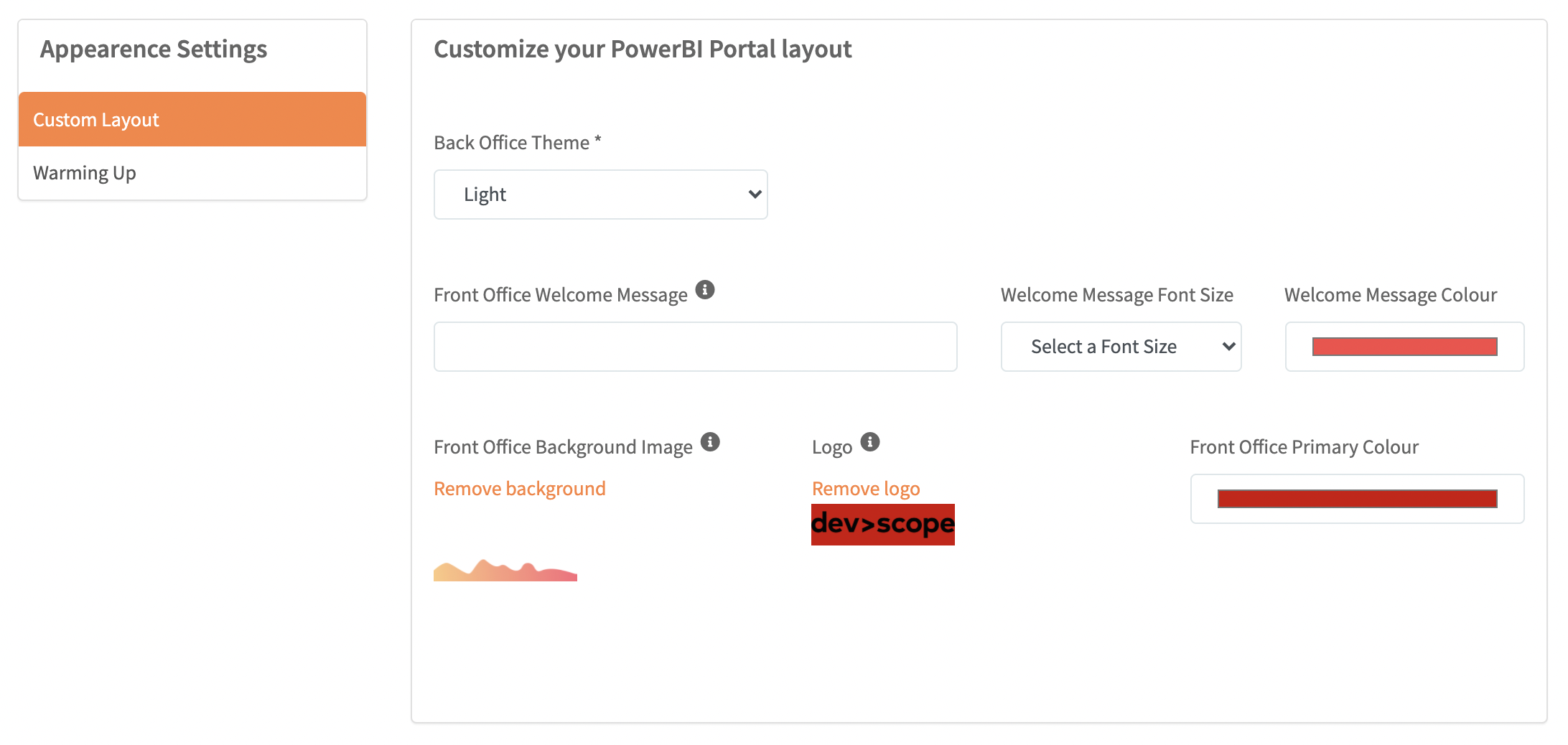 - Frontoffice Background Image: Select the image for your frontoffice Reports Page’s background