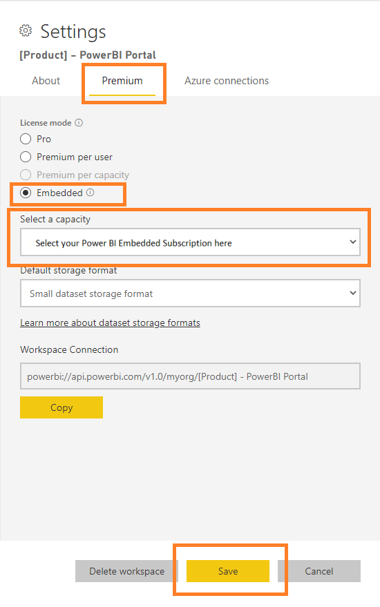 Then, please go to “Workspace settings” in Power BI Online and under the tab “Premium”, turn “On” your Power BI Embedded capacity.
