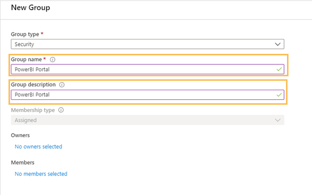 Next, you must create an Group for the PowerBI Portal so it can access the Power BI workspaces you need to share.